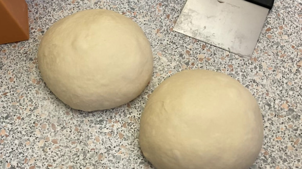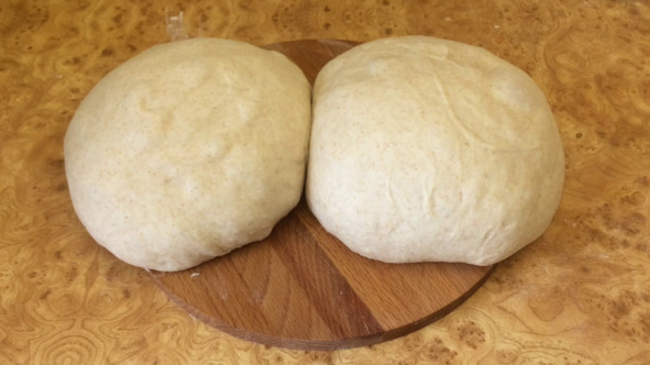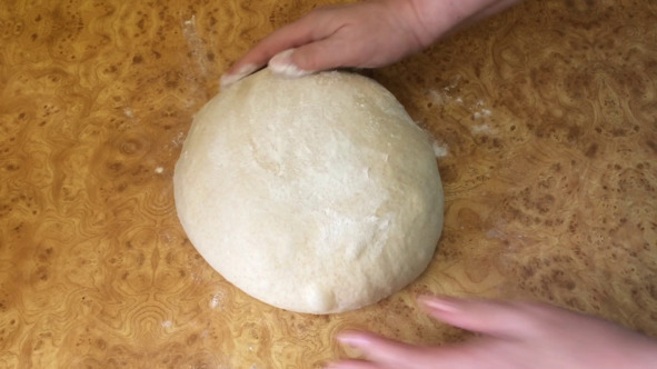 По окончании обминки тесто нужно обязательно перевернуть на другую сторону. Это делается для того, чтобы газ, накапливающийся в тесте, не группировался в одном месте. Далее округляем тесто и одновременно выравниваем его поверхность.