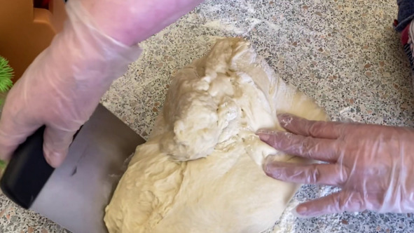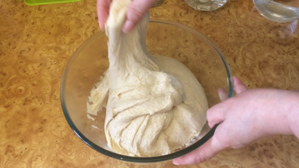 В середине расстойки делаем тесту одну обминку. Обминку делаем методом растягивания теста и складывания. Берём тесто за один край, растягиваем его и складываем к середине или к противоположной стороне. И так – по кругу.