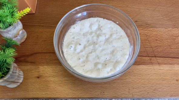 Накрываем пищевой плёнкой и оставляем для созревания до 8—12 часов. За это время закваска (опара) должна увеличиться в объёме раза в 2—3, стать пористой, с многочисленными пузырьками газа, находиться на пике своего созревания и иметь приятный йогуртовый аромат.