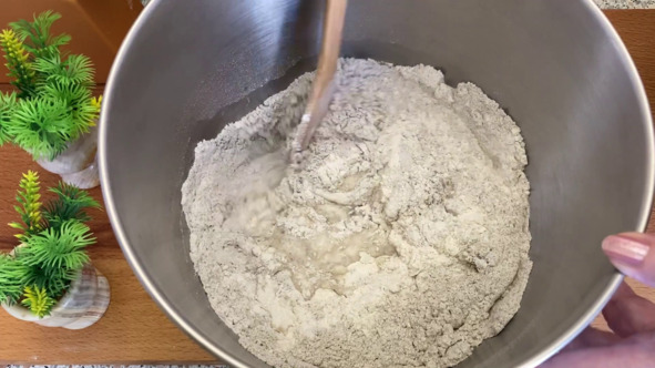 Замешиваем тесто на небольшой скорости тестомеса (миксера) до грубого перемешивания ингредиентов. При необходимости корректируем гидратацию. Накрываем дежу или миску плёнкой и оставляем тесто в покое на 20—60 минут для протекания фазы автолиза (аутолиза). В конце автолиза (аутолиза) посыпаем поверхность теста солью, добавляем растительное масло и завершаем замес теста на средней скорости тестомеса (миксера).