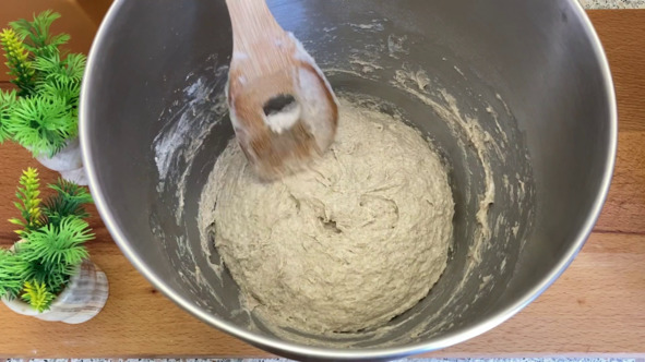 Перемешиваем. Добавляем 50 г цельнозерновой пшеничной муки и 50 мл воды. Размешиваем, накрываем крышкой и оставляем еще на сутки.