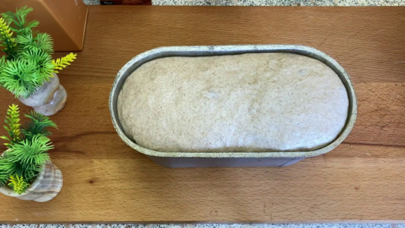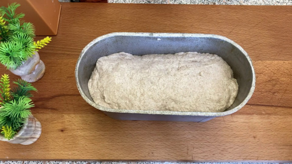 Выравниваем поверхность теста и, после того как выровняли поверхность теста, форму накрываем и оставляем на расстойке на 1—1,5 часа. Во время расстойки следим, чтобы тесто заняло весь объём формы.
