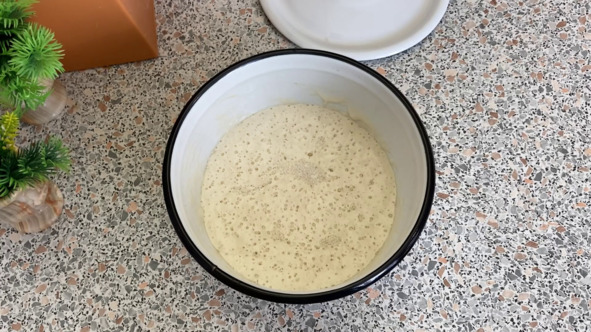 Накрываем пищевой плёнкой и оставляем для созревания до 8—12 часов. За это время закваска (опара) должна увеличиться в объёме раза в 3, находиться на пике своего созревания, покрыться многочисленными пузырьками газа.