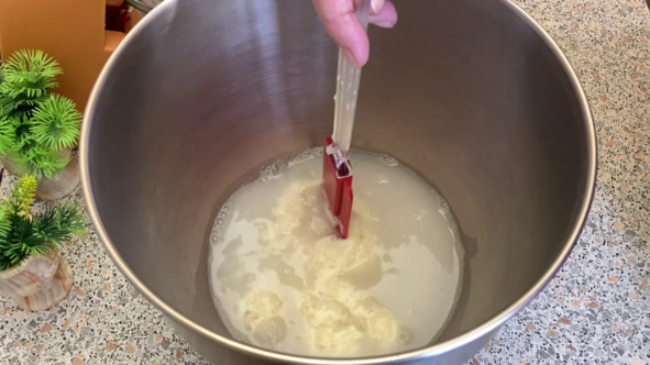 В дежу тестомеса (миксера), если будете замешивать тесто в тестомесе (миксере), или в большую миску, если будете замешивать тесто вручную, выкладываем закваску (опару), добавляем воду или молоко, всё перемешиваем, чтобы проверить насколько хорошо держится закваска (опара) на поверхности жидкости и, если опара не тонет, прекрасно плавает на поверхности жидкости, то это значит, что тесто хорошо поднимется и выпечка получится пышной, пористой.