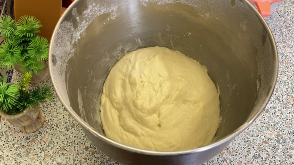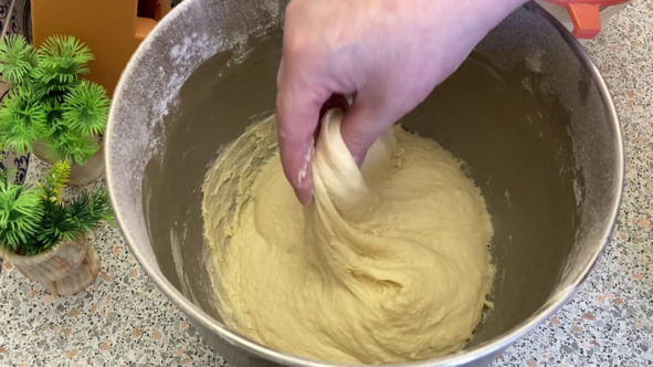 Это тесто легко замесить и вручную. Если вымешивать вручную, то время для замеса нужно увеличить раза в 3.