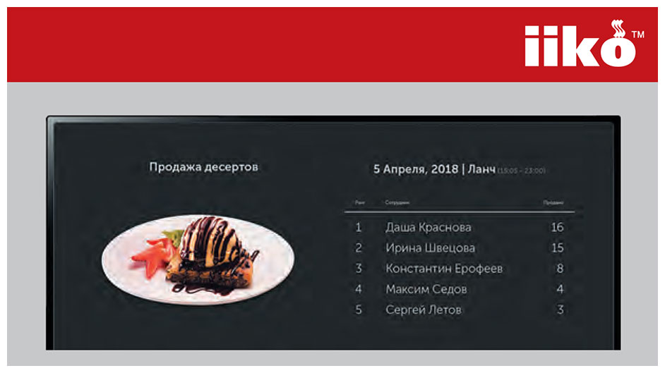 А чтобы стимулировать продажи конкретных блюд, организуйте среди со – трудников соревнование с бонусом для победителя. Настенный экран iikoUpsellDashboard в реальном времени показывает количество чеков с продвигаемым товаром и текущий рейтинг по каждому сотруднику.