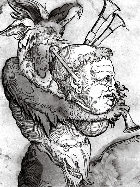 «Дьявол, играющий на волынке, взгромоздившись на монаха». Гравюра Эрхарда Шона по картине Ассафа Кинтцера. Ок. 1530 г.