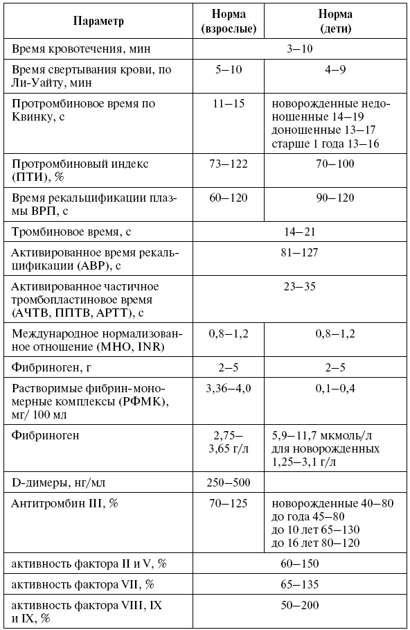 Активированное частичное тромбопластиновое время (АЧТВ). Время рекальцификации бедной тромбоцитами плазмы крови в стандартных условиях, создаваемых внесением каолина – активатора ХII фактора и кефалина – аналога 3-тромбоцитарного фактора, для исключения влияния тромбоцитов на результат исследования (метод Proctor с соавторами). В пластиковую пробирку вносят 0,1 мл бедной тромбоцитами цитратной плазмы, 0,1 мл каолин-кефалиновой суспензии, смешивают и инкубируют при 37 °С в течение 3 мин. Добавляют 0,025 г хлорида кальция равного объема (0,1 мл), подогретого до 37 °С, и включают секундомер. Отмечают время образования сгустка. В норме активированное частичное тромбопластиновое время составляет 30–40 с.