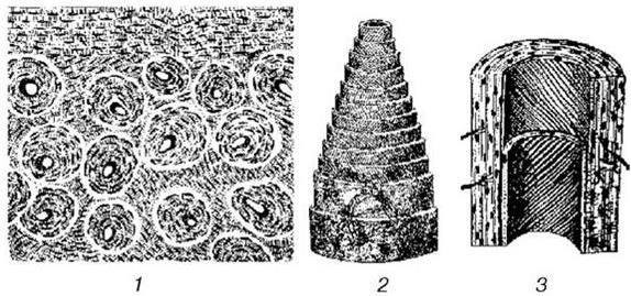 1 – костная ткань; 2 – остеон (реконструкция); 3 – продольный срез остеона