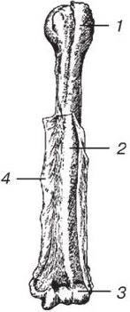 1 – проксимальный (верхний) эпифиз; 2 – диафиз (тело); 3 – дистальный (нижний) эпифиз; 4 – надкостница
