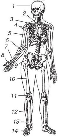 1 – череп; 2 – грудина; 3 – ключица; 4 – ребра; 5 – плечевая кость; 6 – локтевая кость; 7 – лучевая кость; 8 – кости кисти; 9 – тазовая кость; 10 – бедренная кость; 11 – надколенник; 12 – малоберцовая кость; 13 – большеберцовая кость; 14 – кости стопы