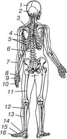 1 – теменная кость; 2 – затылочная кость; 3 – лопатка; 4 – плечевая кость; 5 – ребра; 6 – позвонки; 7 – кости предплечья; 8 – кости запястья; 9 – кости пясти; 10 – фаланги пальцев; 11 – бедренная кость; 12 – большеберцовая кость; 13 – малоберцовая кость; 14 – кости предплюсны; 15 – кости плюсны; 16 – фаланги пальцев