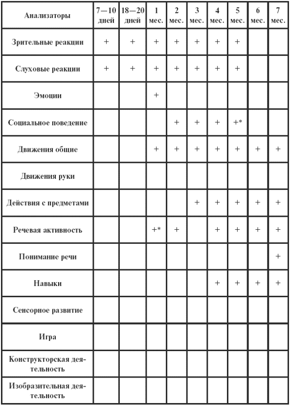 Существует масса таблиц для определения соответствия возрасту определенных навыков. Если ребенок не владеет навыками возрастной группы, говорят о дисгармоничном развитии. Если отмечается отставание более чем на два интервала, говорят об отставании психомоторного развития, на три – о задержке психомоторного развития, а если опережает на три интервала, констатируют опережение психомоторного развития (см. табл. 9).