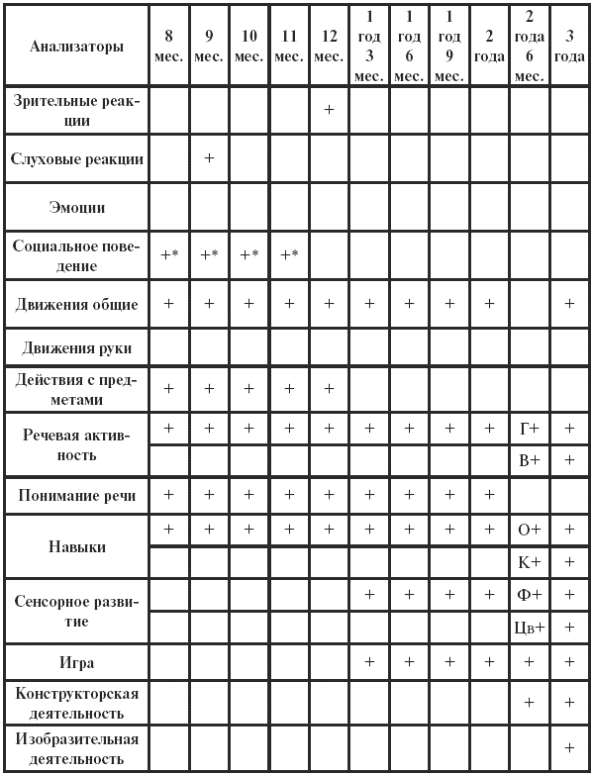 Примечания: Г – грамматика, В – вопросы, О – одевание, К – кормление, Ф – восприятие формы, Цв – восприятие цвета, * – показатель, проверяемый в дошкольных учреждениях (детском саду, доме ребенка, а в некоторых ситуациях – и в семье).