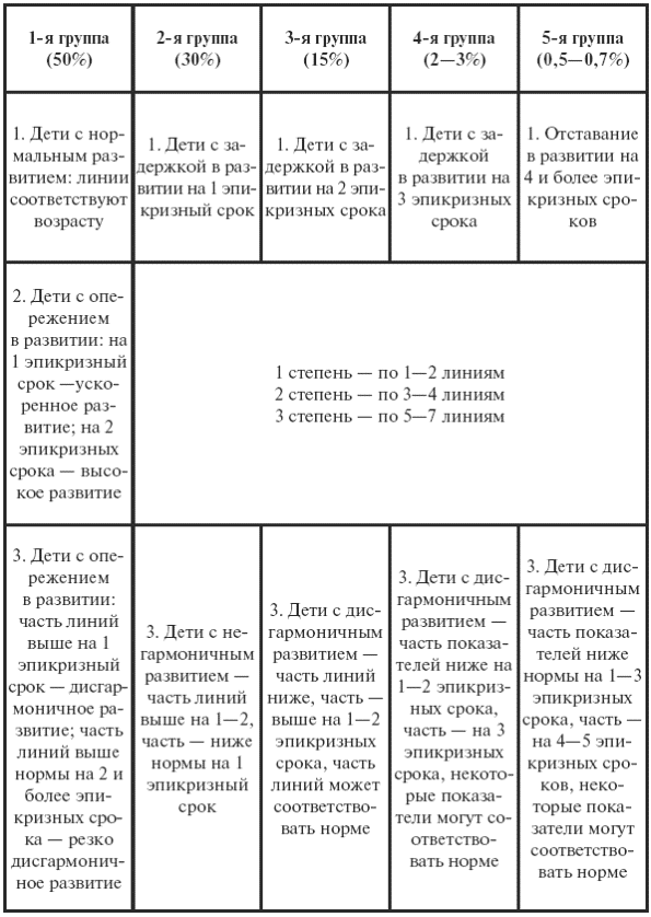 3) при задержке развития отыскивать показатель с низким уровнем и определять группу развития 1, 2, 3, 4, 5.
