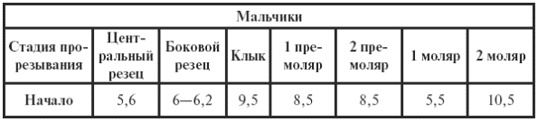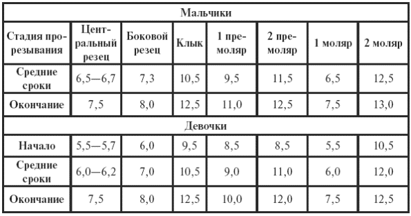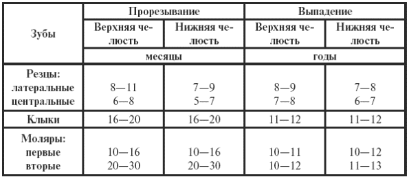 Таблица 11Схема прорезывания и выпадения молочных зубов (Фомин В. А., 2003 г.)