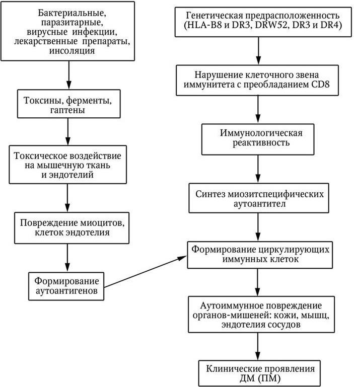 Одним из вероятных механизмов аутоиммунизации у больных ДМ и ПМ является перекрестная реакция между инфекционными антигенами и аутоантигенами, к которым формируются аутоантитела. Образующиеся циркулирующие иммунные комплексы (ЦИК) откладываются в тканях (мышцах, коже, сосудах и др.) и ведут к развитию иммунокомплексного воспаления. Предполагается, что аминоацил-тРНК-синтетазы могут образовывать иммуногенный комплекс с тРНК вирусного генома (например, пикорнавируса). Высказывается предположение о том, что антитела к аминоацилсинтетазам могут принимать непосредственное участие в поражении скелетных мышц. Определенное значение в развитии системных проявлений при ДМ и ПМ могут иметь антитела к эндотелиальным клеткам.
