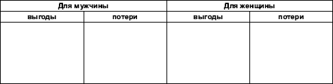 После обсуждения мы просим студентов высказать свои мнения относительно целесообразности следования гендерным стереотипам. Мнения, как правило, расходятся. Тогда мы предлагаем проанализировать преимущества и недостатки для мужчин и женщин наиболее распространенного в России представления о гендерных ролях.