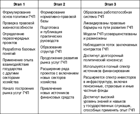 Новые эффективные формы управления ГЧП не могут быть созданы без соответствующей глубокой проработки. Каждая страна проходит через ряд этапов в построении системы управления ГЧП, прежде чем такое партнерство начнет полноценно функционировать (табл. 1).