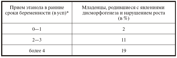 Указанные в заголовке действия проявляются хромосомными абберациями, увеличением процента онкологических заболеваний (особенно печени, органов пищеварения, молочных желез) и алкогольным синдромом плода. Его частота составляет от 1:300 до 1:2000 (в различных странах) или 1:3 у матерей-алкоголичек. Перинатальная смертность достигает 17 %. Дефекты умственного развития среди выживших новорожденных встречаются в 44 % (Маркова И. В., 1999). Большое значение имеет количество употребляемого беременной женщиной спиртного (см. табл. 1).