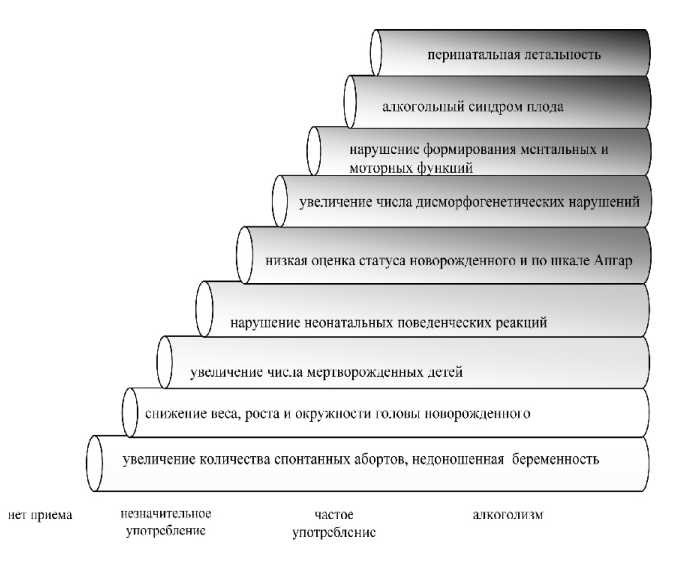 Рис. 5. «Лестница» эмбриотоксических эффектов этанола при различных типах его употребления во время беременности (по: Афанасьев В. В., 1988)