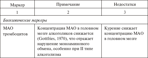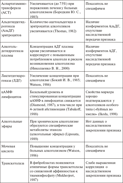 Биологические маркеры алкоголизма представляют собой биохимические, нейрохимические, электрофизиологические, клинические и другие показатели деятельности функциональных систем организма, которые возникают при длительном употреблении этилового алкоголя и сохраняются в организме после полного прекращения его употребления. В результате хромосомных аберраций некоторые маркеры закрепляются настолько прочно, что входят в «генетическую память» и передаются по наследству прямым родственникам. Определение биохимических и электрофизиологических (преимущественно) показателей, характеризующих зависимость от алкоголя, имеет большое значение как для клинической практики, так и для судебно-медицинских исследований.