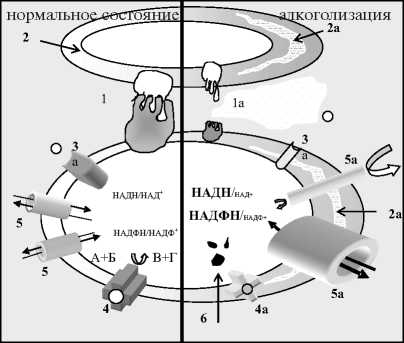 Рис. 6. Изменения в клетках и во внеклеточном пространстве, возникающие при алкоголизации Условные обозначения:1 – нормальное состояние внеклеточного матрикса обеспечивает межклеточные контакты; 1а – нарушение структуры коллагенов, адгезивных белков и протеогликанов приводит к нарушению межклеточных контактов; сохранный билипидный слой (2) и увеличенные интермембранные пространства (2а); рецепторная передача в здоровых мембранах (3) и интернализация рецепторов, наступающая под воздействием этанола (3а); 4 и 4а – ферментативные реакции и их нарушение; 5 и 5а – лиганды и вольтаж-контролируемые ионные каналы, снижение активности одних (например, ГАМК) и увеличение активности других (например, НМДА); 6 – токсические метаболиты этанола (по: Афанасьев А. В., 1999).