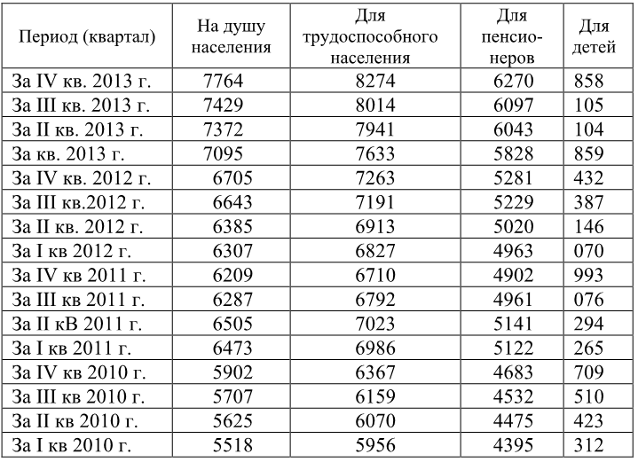 Величина прожиточного минимума в России за 2010-2013 гг.