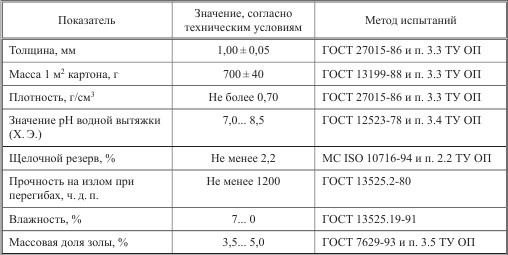 Таблица 1. Показатели качества картона по ТУ ОП 5434-184-00248645-99 «Картон бескислотный для консервации документов»