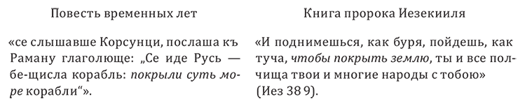 Показательно и то, что в описании бесчинств, которые творит Русь под стенами Константинополя, образы из Хроники Георгия Амартола в рассказе о походе Игоря на Царьград подкрепляются заимствованиями из Жития св. Василия Нового. Так в тексте Повести развивается тема наказания греков за содеянные ими грехи, – тема, которая гораздо яснее звучит именно в Житии Василия Нового. Как считает Д. А. Добровольский, «анализ книжных связей начальной летописи позволяет утверждать, что летописцы XI – начала XII в. целенаправленно строил образ Руси, атакующей Константинополь, по модели «Гога в земле Магог, князя Роша, Мешеха и Фувала». Под названную цель… специально подбирались материалы – выписки из переводных исторических сочинений и фрагменты библейских книг. Однако в Библии князь Гог является важным персонажем мифа о конце света, и может показаться парадоксальным, что «эсхатологический контекст» фактически «обернулся началом истории нового народа» – Руси. Но если вдуматься в особенности иудео-христианской эсхатологии, то ничего странного в подобном ходе мысли нет. Согласно Писанию, появление и разгром народов Гога и Магога должны стать не только знаком гибели нашего мира, но началом новых времен. У Иезекииля вслед за рассказом об истреблении огромного воинства следует подробная… картина восстановленного Храма, поднятого из руин Иерусалима и возрожденного Израильского царства (Иез 40–48). В Откровении Иоанна Богослова обсуждаемый сюжет непосредственно предшествует пророчествам о Страшном Суде, по исполнении которых человечество узрит «новое небо и новую землю, ибо прежнее небо и прежняя земля миновали, и моря уже нет» (Откр 21 1). С точки зрения Церкви, конец света есть не прекращение всякой истории, а переход времени и бытия в принципиально новое качество обо́жения. …Видимо, и масштабные военные предприятия руси рассматривались средневековыми книжниками не как вселенская катастрофа, а как начало некоего принципиально нового периода в истории человечества, периода осуществленных пророчеств и Царства Божия на земле».