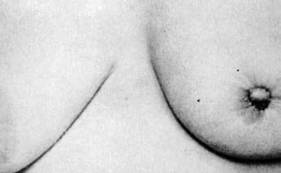Рис. 4. Скиррозный рак молочной железы: звездчатое втягивание левого соска
