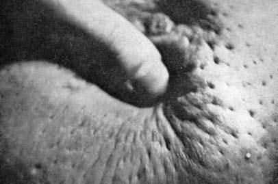 Изменения кожи молочной железы в ряде случаев могут быть связаны с тем, что опухоль распространяется по лимфатическим сосудам, связывающим лимфатическую систему органа с подкожной лимфатической сетью. При этом наступает ограничение смещаемости клетчатки над новообразованием, а затем и кожи над ним и наблюдаются симптомы «площадки» (уплощение и небольшое западение кожи над образованием, возможность взятия кожи в складку резко ограничена или отсутствует), «умбиликации» (полная фиксация, сморщивание и втянутость участка кожи над опухолью), «лимонной корки» (развивается на фоне лимфостаза) (рис. 4, 5).