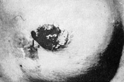 Рис. 9. Кровянистые выделения из многочисленных отверстий при папилломатозе молочных протоков