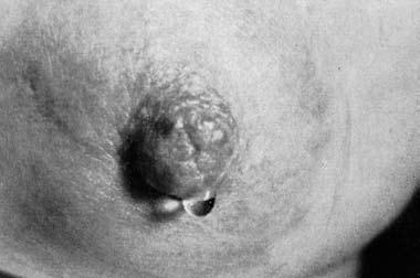 В случае центрального расположения опухоли при малых ее размерах отмечается отклонение соска в сторону или его фиксация. При более распространенном процессе в результате прорастания крупных выводных протоков соска развивается его втяжение.