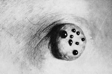 Другие изменения соска наблюдаются при раке Педжета. Это самостоятельная форма плоскоклеточного рака, описанная впервые в 1874 году Педжетом. Отмеченные им изменения соска с самого начала являются следствием развития злокачественной опухоли со своеобразным ростом и течением. Макроскопически наблюдается постепенное покраснение и уплотнение кожи в области соска с образованием мокнущих корок и струпьев, при удалении которых обнажается влажная зернистая поверхность, лишенная эпидермального покрова. Опухоль может захватывать не только сосок, но и ареолу, и даже выходить за ее пределы. Несмотря на значительное распространение, карцинома долгое время развивается поверхностно. Инвазия опухоли вглубь железы происходит преимущественно по выводным млечным протокам (рис. 6).