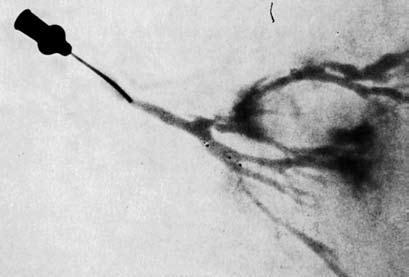 Рис. 11. Дуктограмма: контрастное вещество через выводящий проток попадает в более мелкие протоки молочной железы и окружает там овальное новообразование с неровными контурами