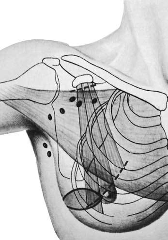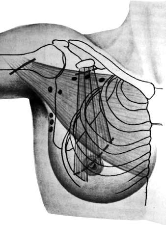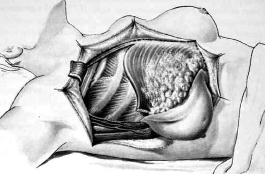 Операция по Patey-Dyson заключается в удалении молочной железы с опухолью единым блоком с подмышечными лимфатическими узлами двух уровней и малой грудной мышцей (рис. 14). Эта операция является менее травматичной, чем мастэктомия по Halsted-Meyer, так как сохраняется большая грудная мышца.