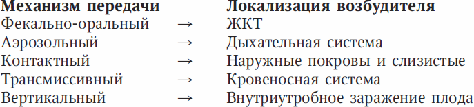 Механизм передачи инфекции – типичная или специфическая способность возбудителя перемещаться из одного организма в другой. Механизм передачи – то, каким образом происходит передача инфекции. Путь – совокупность факторов передачи или один фактор передачи, т. е. элементы среды, обеспечивающие перемещение возбудителя в данное конкретное время и в данной конкретной обстановке, – это то, через какие объекты происходит передача инфекционного агента.