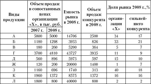 Таблица 5.1. Характеристика рыночной ситуации по конкретным видам продукции, выпускаемой организацией «Х»