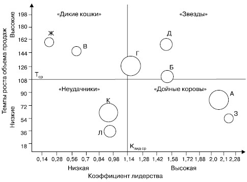 Результаты расчетов представлены в табл. 5.2. Дополнительно для построения матрицы следует рассчитать: 1) средний темп роста объема продаж (Тср):