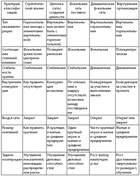 Опираясь на этот подход к классификации, группа ученых под руководством Ш. Кляйна описала пять основных типов сетей по совокупности нескольких критериев [Riemer et al., 2005], главными из которых были критерии Зюдова – Винделера. В такой трактовке может быть выделено пять типов межфирменных сетей с использованием совокупности следующих критериев: тип квазиинтеграции (вертикальная или горизонтальная), степень равноправности взаимоотношений (фокальная или полицентрическая сеть), стабильность группы, наличие или отсутствие внутренней конкуренции и барьеров входа в сеть, размер компаний-участников и характерные задачи, преследуемые посредством кооперирования ресурсов и компетенций (табл. 2.2).
