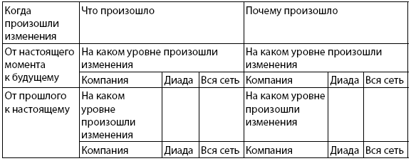 Ярким примером может служить предложенный недавно метод дотограмм [Abrahamsen et al., 2012]. Этот аналитический метод нацелен на изучение изменений, происходящих в сетях, с использованием трех основных параметров: время (до изменения, в момент изменения, будущее после изменения), уровень сетевых изменений (изменения для одного актора, в диадных взаимодействиях, затрагивающие всю сеть), а также понимание причин происходящих изменений (табл. 2.3). Акцент делается на восприятие изменений менеджерами компаний – участников сети.