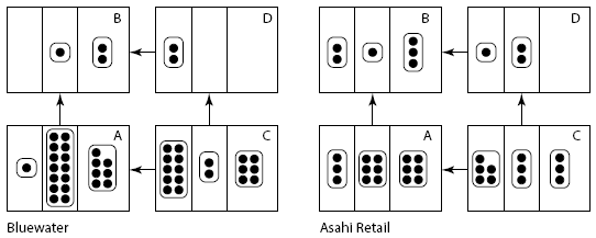 На рис. 2.5 представлен пример дотограмм, построенных на основе данных, полученных при изучении восприятия процессов изменений ключевыми менеджерами фокальных компаний сетей дистрибуции, действующих на рыбном рынке. Дотограммы построены для четырех компаний сети. Количество точек говорит о том, насколько высока, по мнению менеджеров, интенсивность происходящих изменений. То, где именно располагаются точки, свидетельствует об уровне сетевых взаимодействий (степени вовлеченности в происходящие изменения). Благодаря построению дотограмм возможно проследить и оценить, насколько по-разному воспринимаются изменения, происходящие внутри сети, ее акторами, а также каково стремление отдельных участников вовлечь в происходящие изменения других партнеров по сети.