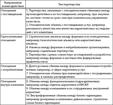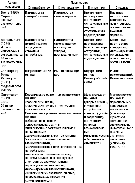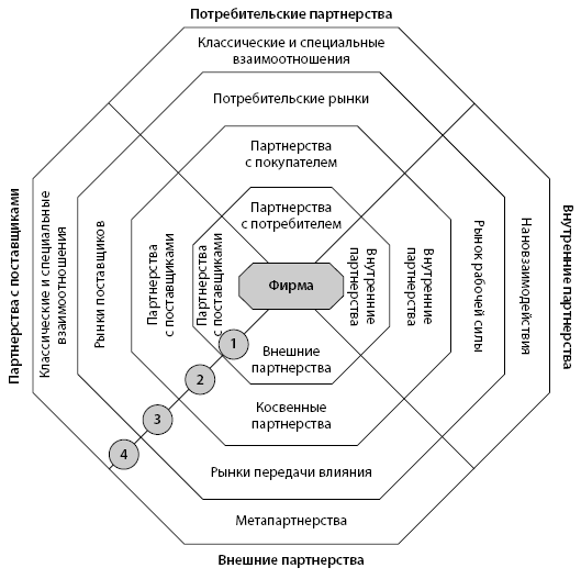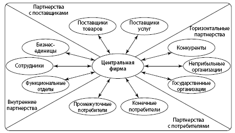 П. Дойль анализирует систему взаимоотношений компании с партнерами, выделяя отношения центральной фирмы и ее четырех направлений сотрудничества: партнерства с потребителями; партнерства с поставщиками; внутренние партнерства, куда отнесены взаимоотношения с сотрудниками, функциональными отделами и стратегическими подразделениями компании; внешние партнерства, к которым относятся взаимоотношения с конкурентами, государственными и правительственными организациями, органами власти, а также внешние партнеры [Doyle, 1995].