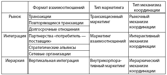 Как видно из таблицы, интерактивный механизм координации в маркетинге взаимоотношений соответствует характеристикам механизма координации «сеть», рассматривавшегося в рамках новой институциональной экономической теории (см. и. 1.1). Транзакционный маркетинг предполагает единичные сделки и характеризуется однократным обменом ценностью между взаимодействующими сторонами, основным критерием выбора партнера при этом является конкурентоспособная цена. Формат повторных транзакций, включающий заключение повторных сделок, свидетельствует о возросшей лояльности партнеров, в то время как формат долгосрочного контракта подразумевает специфичные транзакции и предполагает взаимодействие сторон в рамках обсуждения цены. Маркетингу взаимоотношений соответствует интерактивный механизм координации, который имеет место при следующих форматах отношений: партнерства «потребитель – поставщик», стратегические альянсы и сетевые организации (табл. 3.4).