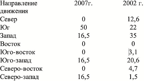 В период экспедиции в районе Обь-Енисейского мелководья наблюдалась активная миграция белого медведя в южном направлении (т. е. в сторону заприпайной полыньи). Направление следов зверей по 8 румбам показано в табл. 1. Для сравнения приводим направления следов, отмеченных в данном районе в октябре-ноябре 2002 г., когда в этом же районе наблюдалась активная миграция белого медведя в западном и юго-западном направлениях (т. е. в сторону кромки). Таким образом, в оба сравниваемых года перемещения животных совпадали, в общем, с направлением нарастания ледового покрова.