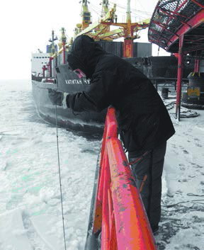 Рис. 12. Отбор проб воды из поверхностного горизонта с борта а/л «Арктика» в апреле 2008 г.