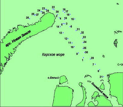 Рис. 13. Карта-схема расположения точек отбора гидрохимических проб в Карском море в марте-апреле 2008 г.