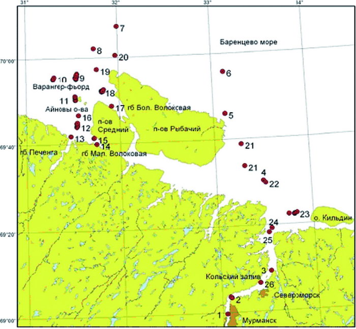 Экспедиция 1–4 марта 2007 годаОснову маршрута экспедиции составляли три разреза в Варангер-фьорде (губы Печенга, Малая и Большая Волоковая). Кроме того, выполнены станции в районе о. Кильдин, Кольском заливе и на траверзе некоторых мысов п-ова Рыбачий (рис. 14). В ходе работ выполнено 26 станций. В течение всего рейса проводились наблюдения за морскими млекопитающими и птицами на станциях и по маршруту движения.