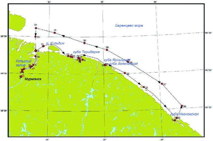 Экспедиция 29 мая – 2 июня 2007 г.Основу маршрута экспедиции составляли станции в Кольском заливе, Териберской, Ярнышной, Зеленецкой, Ивановской губах и вдоль границы 12-мильной зоны в Баренцевом море (рис. 15). Всего в ходе экспедиции было выполнено 34 станции. В течение всего рейса проводились наблюдения за морскими млекопитающими и птицами на станциях и по маршруту движения.